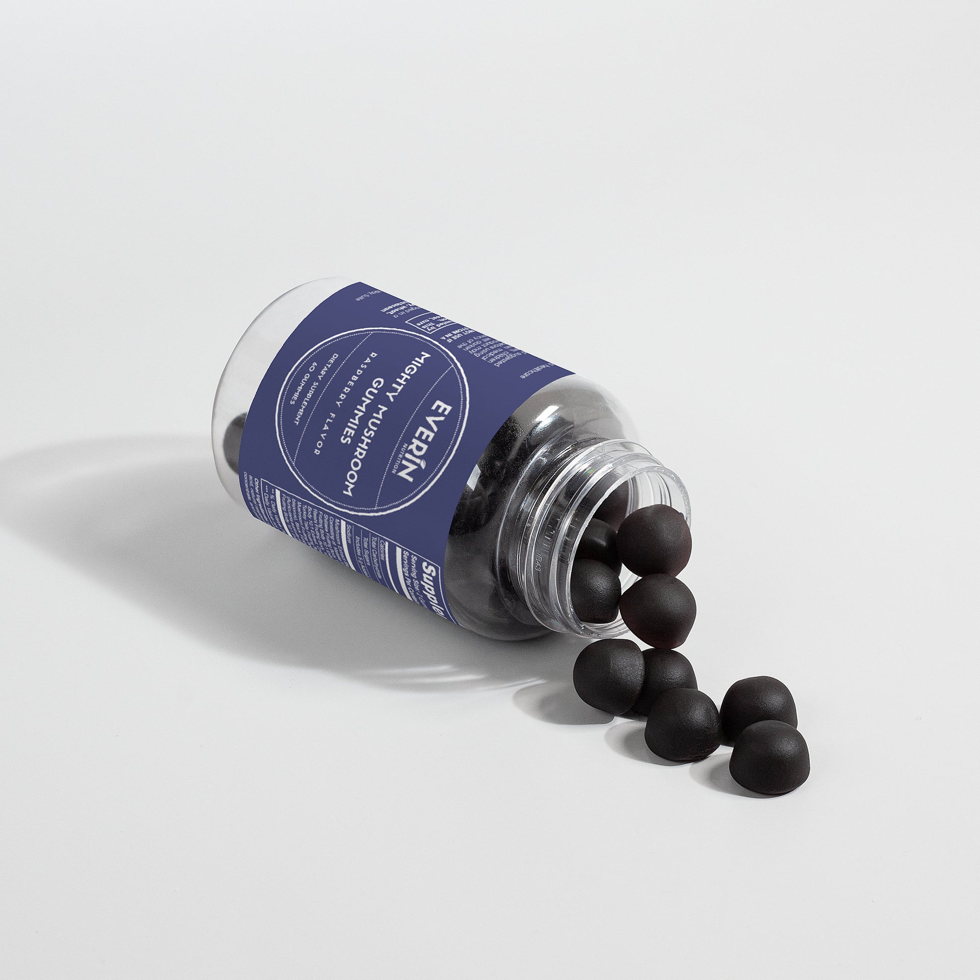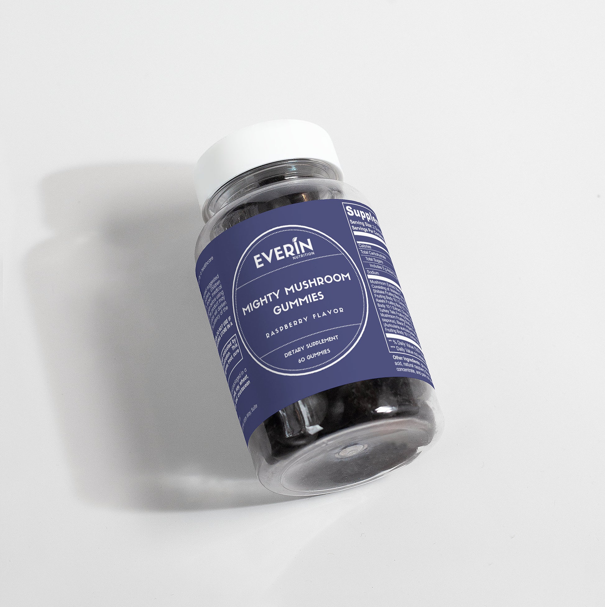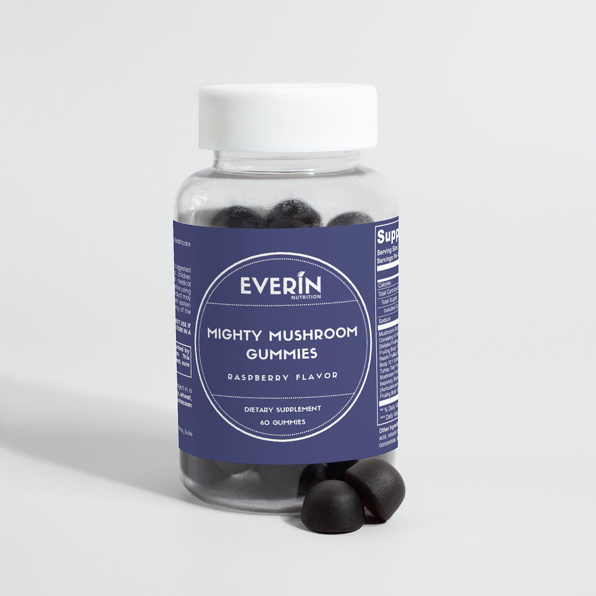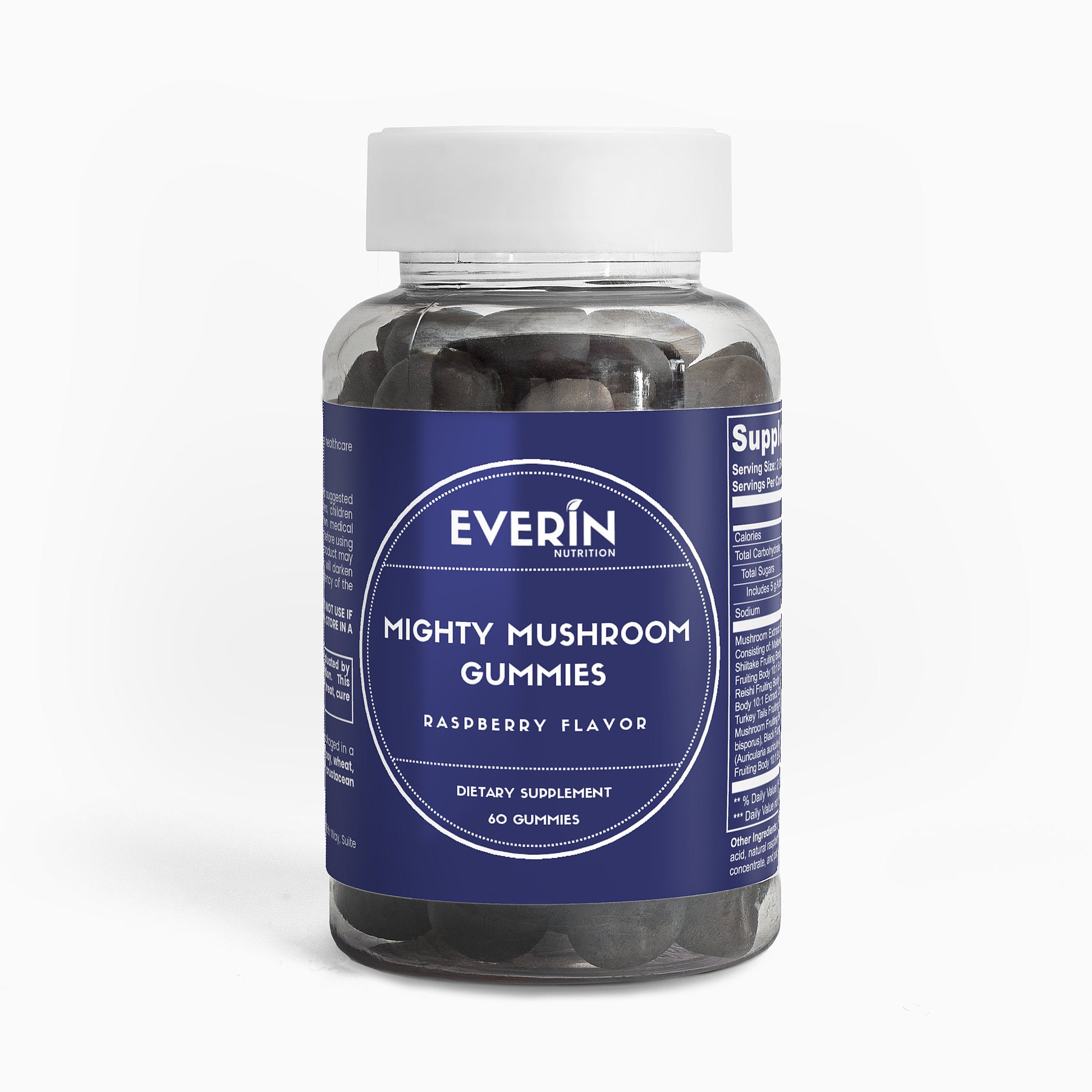 Ingredients: Mushroom extract (Maitake Fruiting Body 10:1 Extract, Shiitake Fruiting Body 10: 1 Extract, Lion’s Mane Fruiting Body 10:1 Extract, Reishi Fruiting Body 10:1 Extract, Cordyceps Fruiting Body 10:1 Extract, Chaga Fruiting Body 10:1 Extract, Turkey Tails Fruiting Body 10:1 Extract, White Button Mushroom Fruiting Body 10:1 Extract, Black Fungus Fruiting Body 10:1 Extract, Royal Sun Mushroom Fruiting Body 10:1 Extract), glucose syrup, sugar, dextrose, pectin, citric acid, natural raspberry flavor, sodium citrate, purple carrot juice concentrate, palm oil (contains carnauba wax).